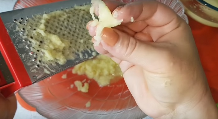 2.Zetrzyj na tarce surowe ziemniaki na drobnych oczkach, wodę ze skrobią mocno wyciśnij. Koniecznie jej nie wylewaj, bo na pewno Ci się jeszcze przyda.