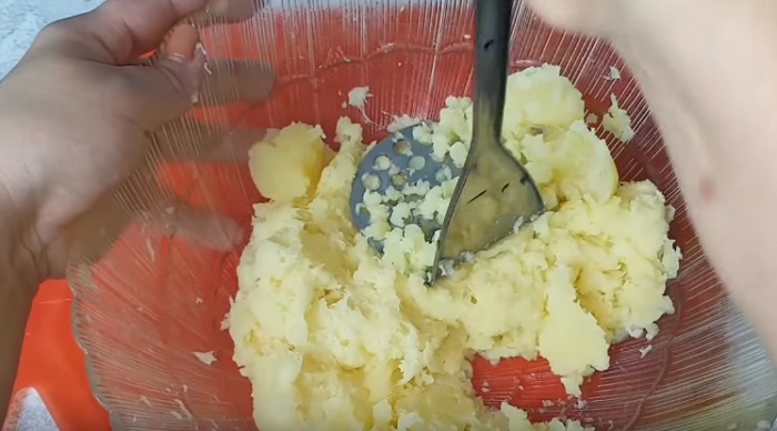 3.Przez prasę przeciśnij ugotowane ziemniaki, i dodaj je do startych surowych ziemniaków.