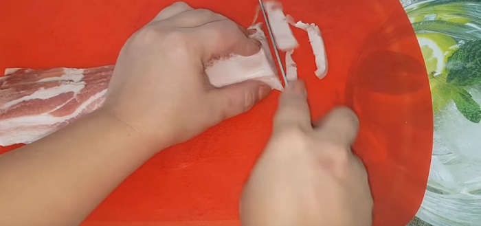8. W międzyczasie pokrój boczek oraz cebulę w drobną kostkę. Na patelnię wlej olej i smaż pokrojoną cebulę oraz boczek na złoty kolor.