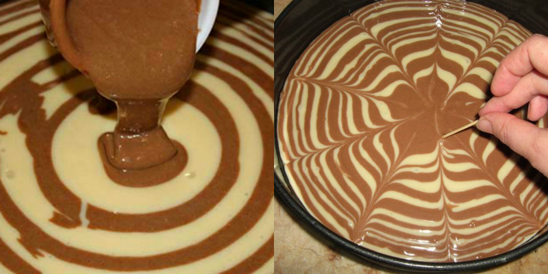 3. Dokładnie posmaruj olejem słonecznikowym formę do pieczenia. Na przemian wlewaj ciasto , kierując od zewnętrznej części ku środkowi tworząc zebrę. Jak masz ochotę za pomocą wykałaczki zrób wzór pajęczyny.