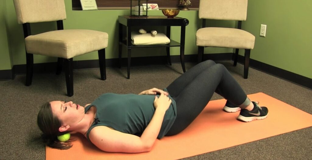 3. Połóż się tak by oprzeć głowę na piłce. W ten sposób ciężar ciała spowoduje, że piłka będzie masować mięśnie. Ważne jest by w trakcie ćwiczenia głęboko oddychać. Zrelaksuj się i pozwól piłce masować mięśnie. Następnie przesuń piłkę w górę i w dół i powtórz ćwiczenia. Możesz delikatnie przechylić głowę na lewo i na prawo.
