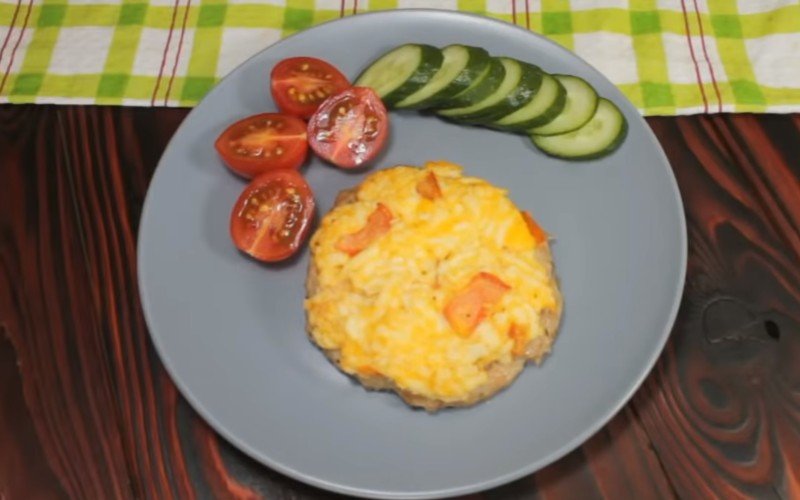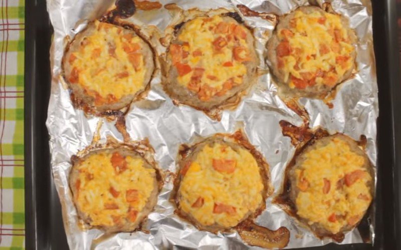 5.Na formę ułóż papier do pieczenia , a na niego kładź uformowane kotlety, na górę połóż przygotowaną masę oraz pomidory.