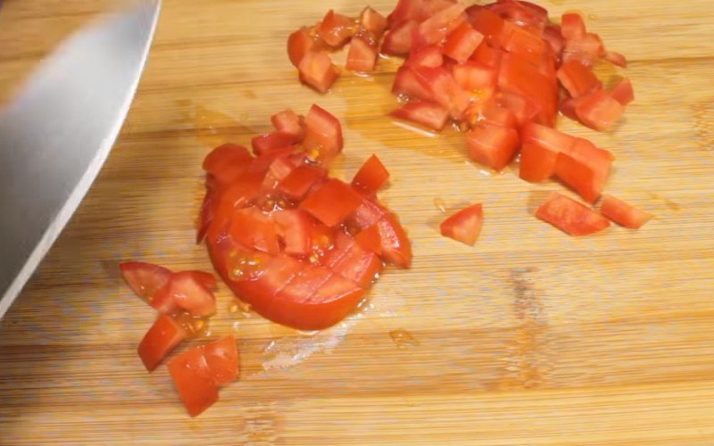 3.W drobną kostkę pokrój pomidora , następnie dodaj do masy serowo-jajecznej.