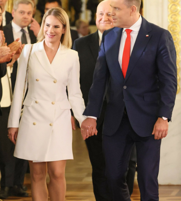 Nie sposób było oderwać wzroku od Marty Nawrockiej, która podczas oficjalnej uroczystości zabłysnęła szykiem i klasą. Przyszła Pierwsza Dama zaprezentowała się w białej sukience o modnym żakietowym kroju, przyozdobionej złotymi guzikami, które nadawały stylizacji niepowtarzalnego charakteru. Całość dopełniły złote buty oraz niewielka torebka, które tworzyły harmonijną, elegancką kompozycję.