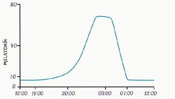 Otóż melatonina, czyli hormon snu, wytwarza się tylko w nocy. Zaburzona produkcja melatoniny oznacza problemy z zaśnięciem, rozregulowany sen i notoryczne zmęczenie. Na powyższym wykresie możecie zobaczyć, o której godzinie ma miejsce wzmożona produkcja melatoniny.