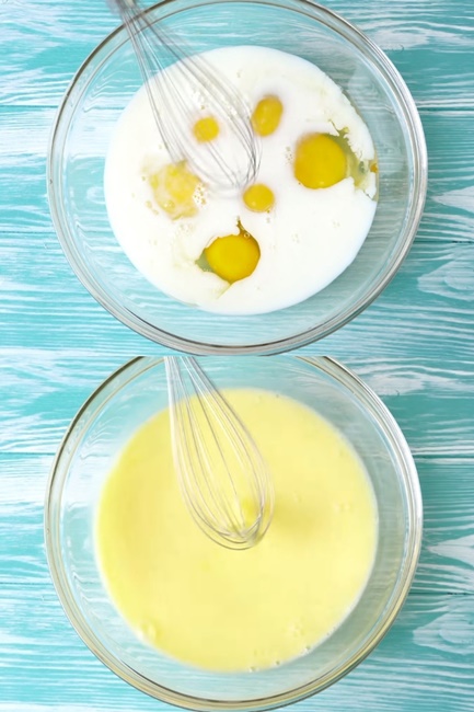 1.Do miski wlej mleko i dodaj rozbite jajka, przypraw solą oraz pieprzem i dokładnie wymieszaj za pomocą trzepaczki lub widelca, tak aby powstała jednolita konsystencja.