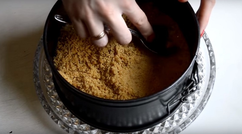 2.Na przygotowaną formę wyłóż papier do pieczenia i wsyp na dno ciasta, następnie dokładnie wyrównaj. Aby stwardniały wstaw na 30 minut do lodówki.