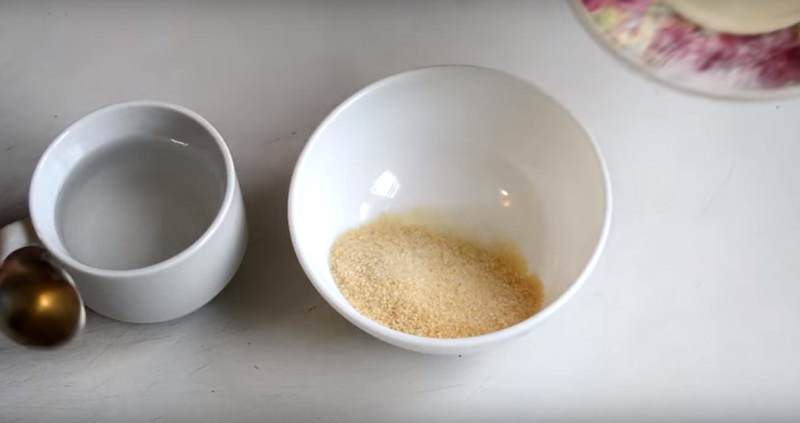 3.Teraz masz czas na przygotowanie masy. Żelatynę wsyp do ¾ szklanki wody , następnie odstaw na 10 minut. Po tym czasie w kąpieli wodnej ją rozpuść.