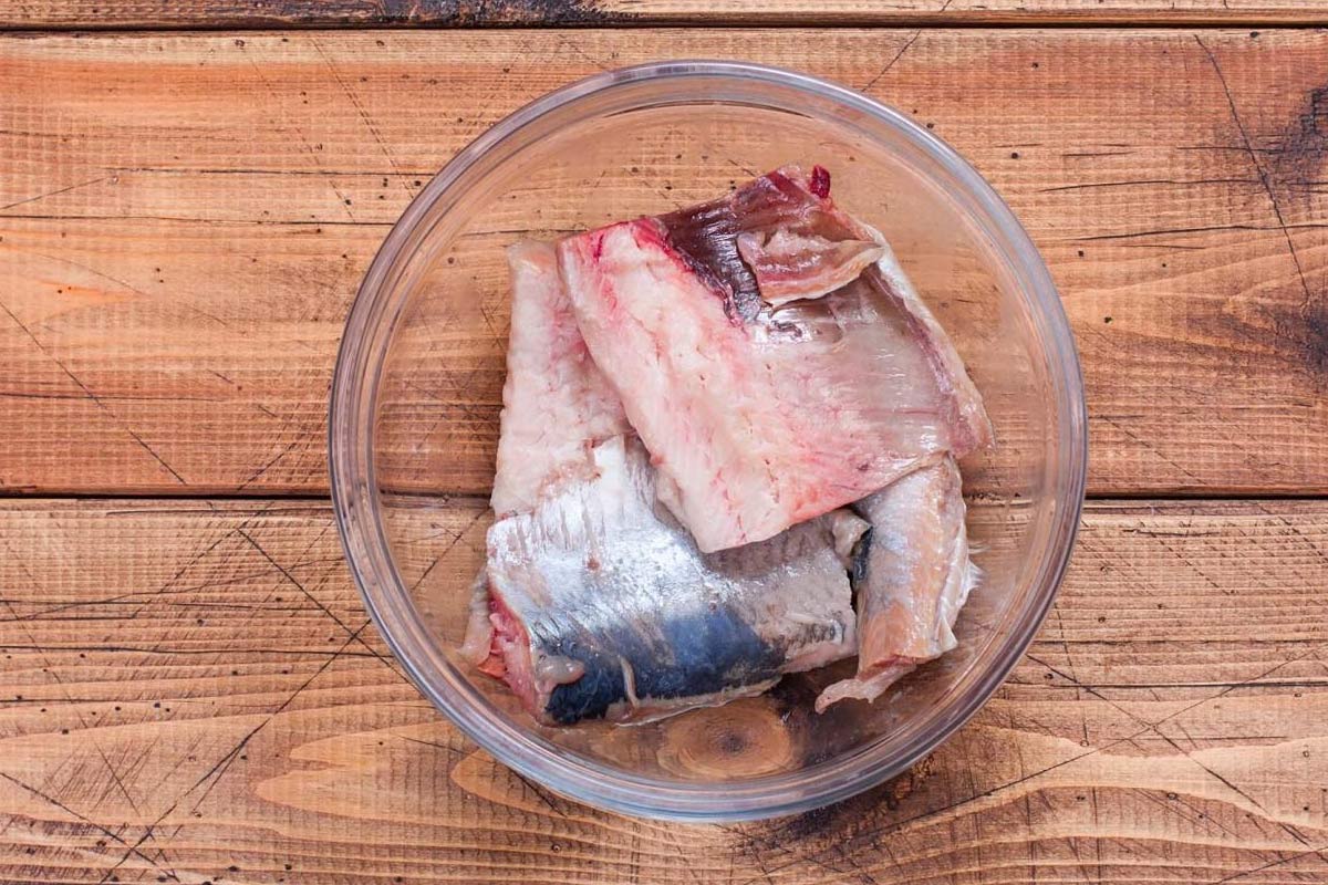 1. Płaty śledziowe wyczyść, dokładnie umyj i przekrój na pół.