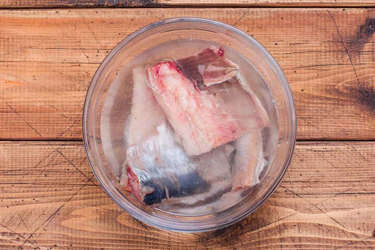 2. W dużej misce, wymieszaj wodę z solą i zanurz w solance śledzie. Wstaw do lodówki na 2 godziny.