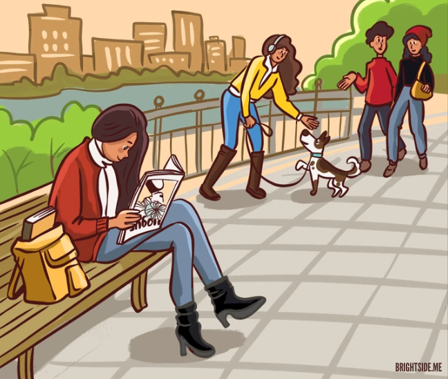 Kobieta na ławce pogrążona w lekturze, ludzie spacerują, pies merda ogonem – wszystko wygląda jak zwykły dzień w mieście. Ale jeśli spojrzysz uważniej, coś tu się nie zgadza!